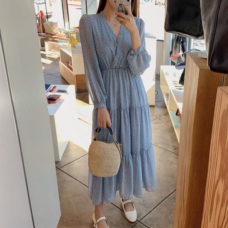 ワンピース ロング レディース ロングワンピース ドット柄 Vネック カシュクール シフォン 長袖 ペールブルー 韓国 メール便送料無料 Ch Wn 5023 海外ファッション Joyfeel 通販 Yahoo ショッピング